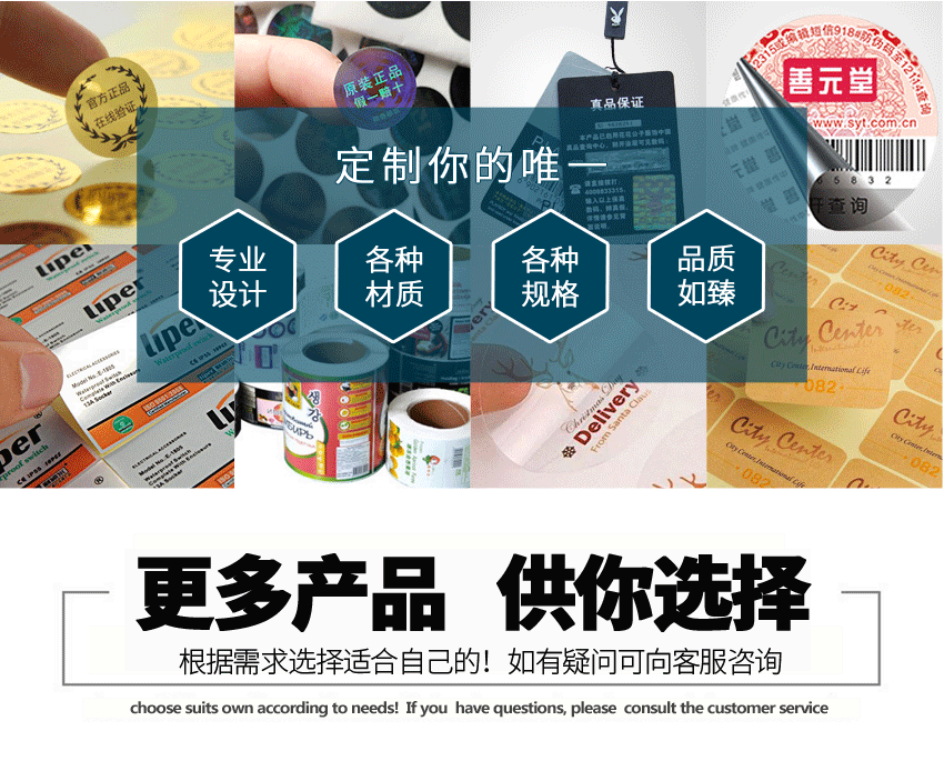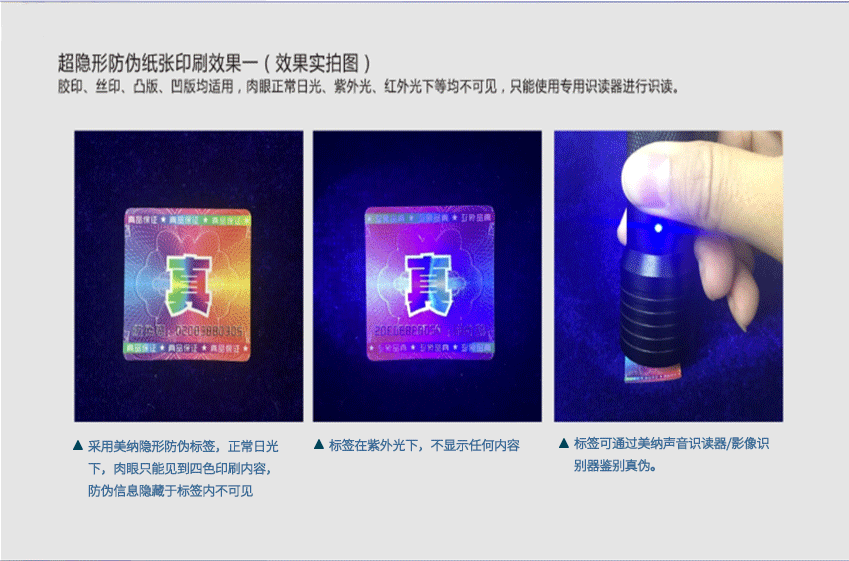 均無法被發(fā)現(xiàn)、被破壞、被復(fù)制、被仿造。通過明碼防偽標(biāo)簽+隱形防偽暗碼雙重功能,讓假冒產(chǎn)品無所遁形。