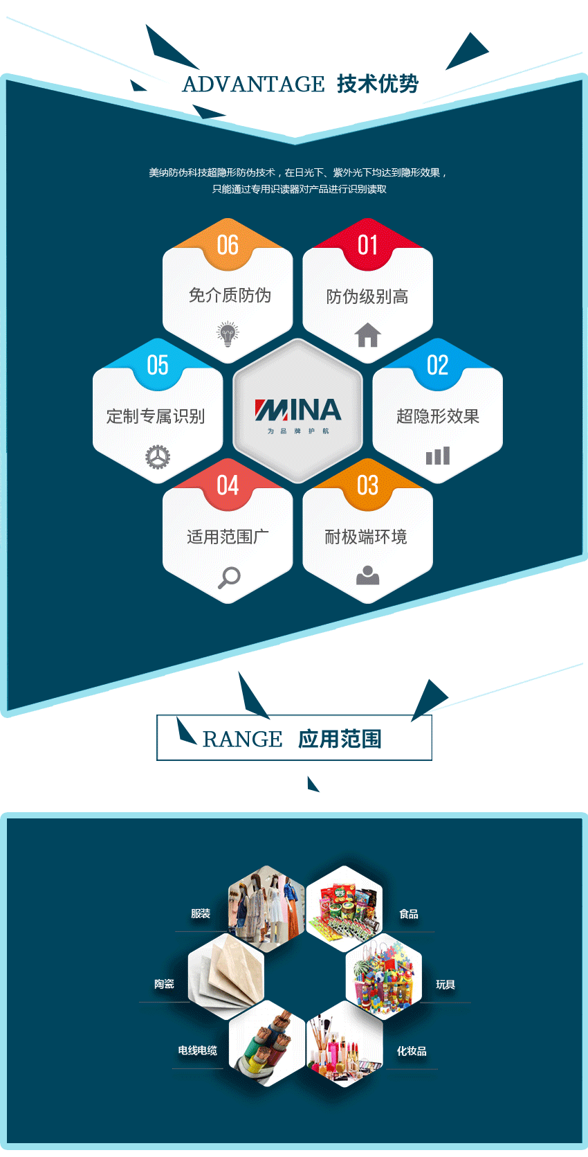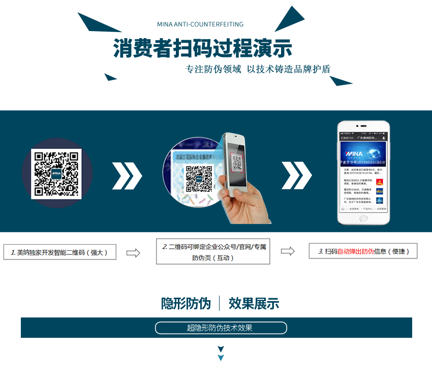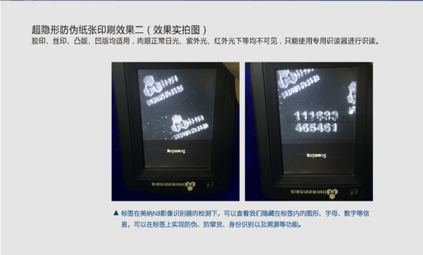美納超隱形防偽技術(shù),可與各種材料載體完美結(jié)合,使防偽與防竄貨信息隱匿于材料載體中,通過肉眼、或是紫外光、紅外光等其他傳統(tǒng)檢查設(shè)備,